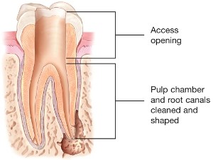Root canal treatment begins with numbing (anesthetizing) the tooth to ensure a comfortable and pain free appointment. Then a protective shield (dental dam) is placed over the offending tooth to provide isolation and maintain a clean environment. Next, an opening (access) is made through the top (crown) of tooth. At this time decay is removed, so only clean and healthy tooth tissue remains, and the canals are located.