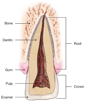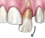 A chipped tooth (or crown fracture) is a type of fracture on the top (crown) of the tooth that involves the enamel, dentin, or nerve (pulp) with loss of tooth structure. If the pulp is involved then either full, or partial (pulpotomy) root canal treatment is needed. This is done to remove any portion of the pulp which has already been contaminated by bacteria from the oral cavity, in order to prevent any future tooth infection.