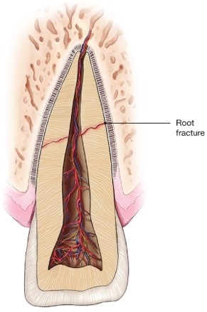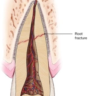 A root fracture (horizontal root fracture) is a type of dental traumatic injury that typically results from a horizontal force directed to the tooth. This fracture in the root divides the tooth into two segments. If no sign of infection is present, then treatment consists of reposition the top (coronal) segment of the tooth and splinting it for typically 4 weeks. If infection is present then root canal treatment, and sometimes endodontic surgery, may be needed.