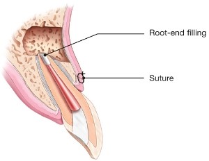 The small, infected portion of the root(s) is/are removed. Then the root(s) are prepared with small, special instruments, and then filled and sealed from the root end. Depending on the size of the infection and the amount and location of bone loss, a bone graft may be placed. The gums are then sutured back into place and post operative instructions are provided.